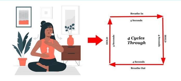 Breathe in for 4 counts. Hold for 4 counts. Breathe out for 4 counts. Hold empty for 4 counts.