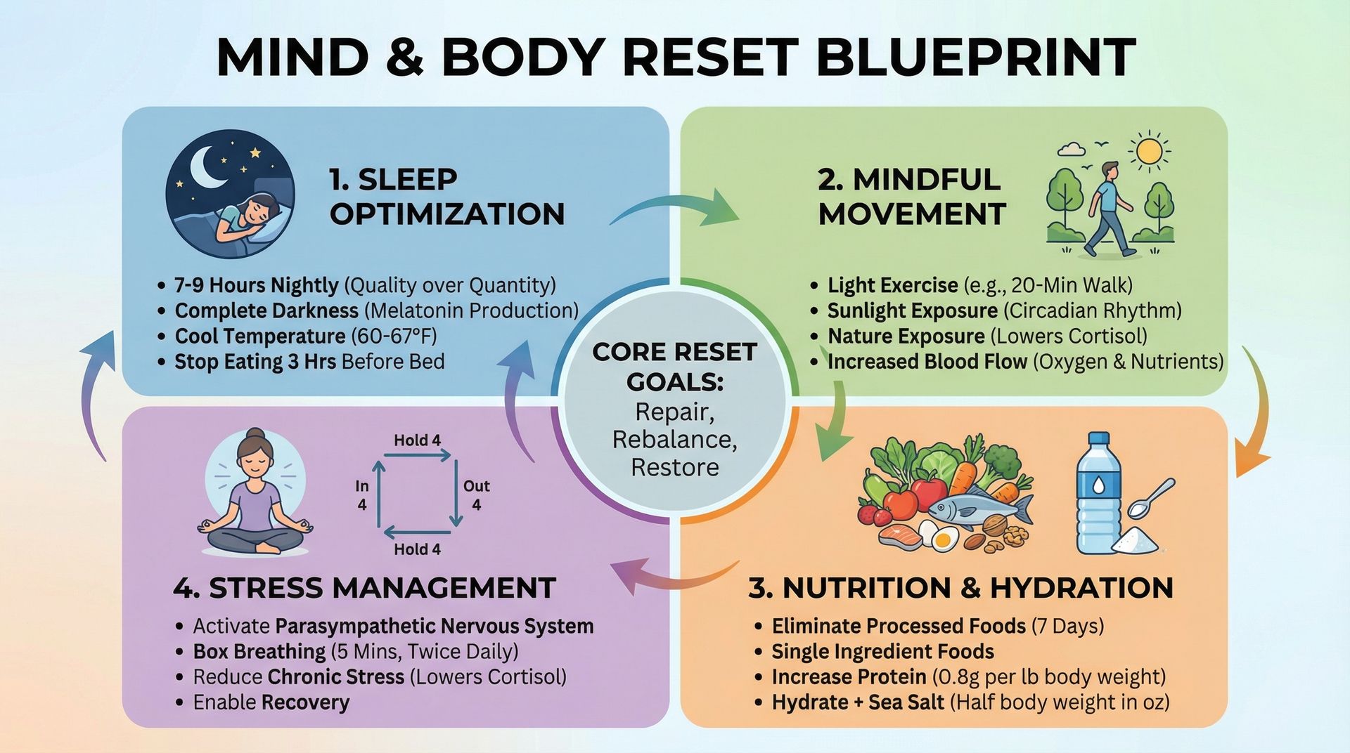 Chronic stress keeps cortisol elevated constantly. High cortisol breaks down muscle tissue, stores belly fat, and prevents deep sleep. You cannot reset while stressed.