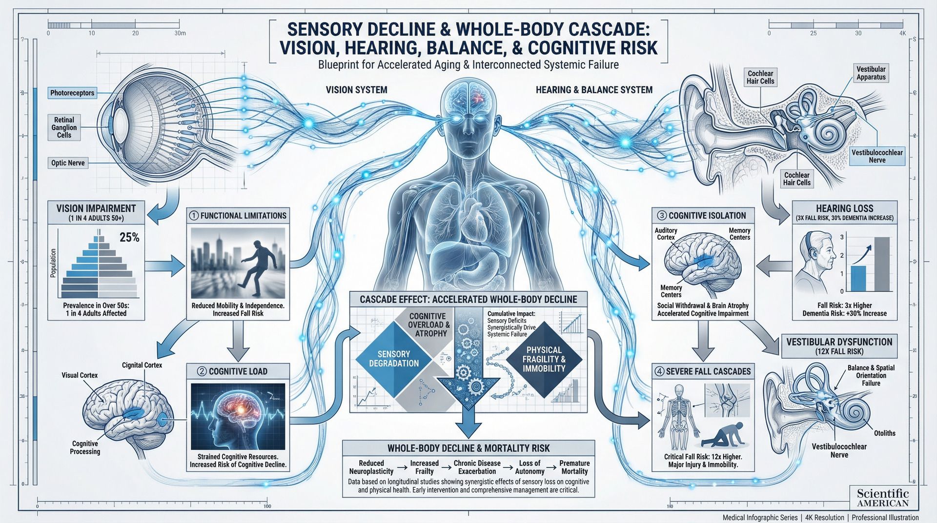 Sensory loss drives whole body decline through falls, cognitive overload, and neurodegeneration.