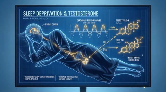 Your body makes most of its testosterone during deep sleep. When you cut sleep short, hormone production crashes. Cortisol spikes instead, blocking testosterone even further.