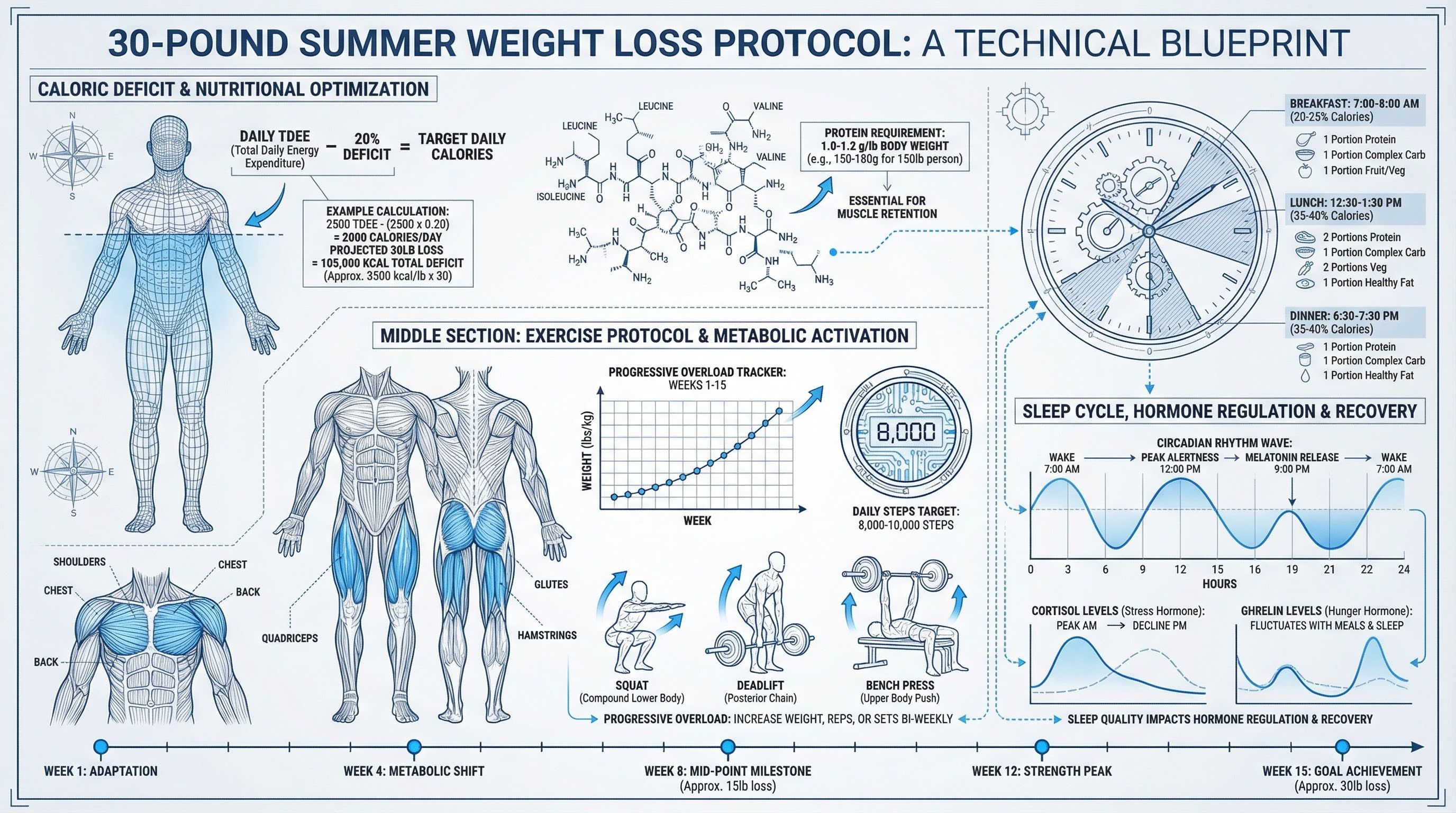 The protocol works because it addresses all the variables. Caloric deficit for fat loss. Protein for muscle preservation. Strength training to boost metabolism. Steps for NEAT. Sleep and hydration for recovery.