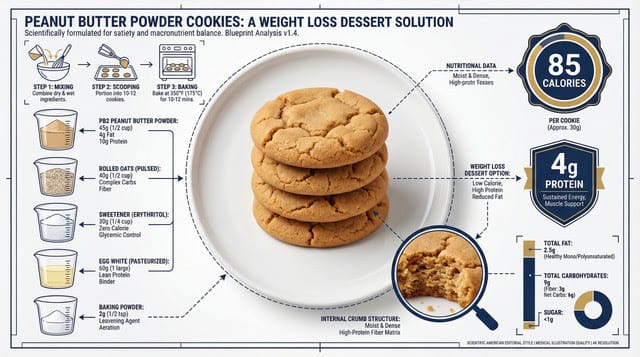 Mix 1/2 cup PB2, 1/4 cup oats, 2 tbsp sweetener, 1 egg white, and a pinch of baking powder. Scoop into 8 cookies. Bake at 175°C for 10 to 12 minutes.