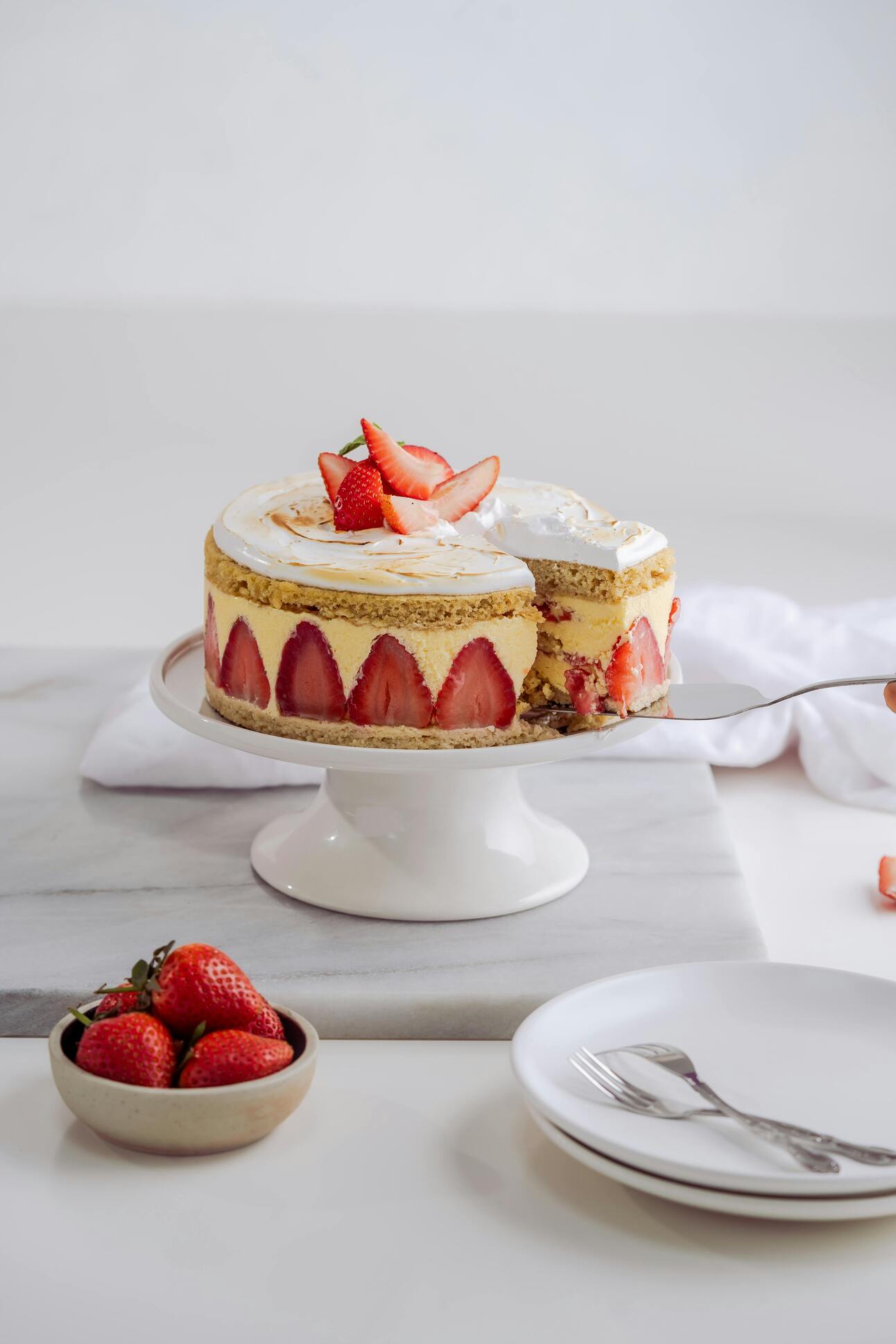 Once the cake has cooled, top it with the sliced strawberries. Optionally, you can add a dollop of Greek yogurt or whipped cream for extra flavor.